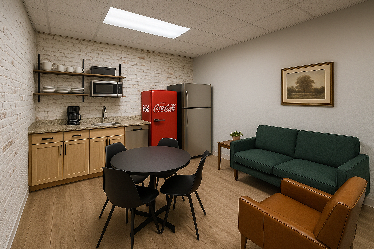 Kitchen and Lounge Area: Coworking style lounge and shared open space are included for all client use.